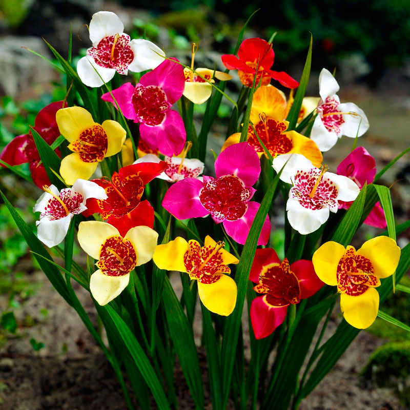 Главная особенность тигридии — каждый отдельный цветок живет всего 8-10 часов, раскрываясь в первой половине дня . Однако не спешите отказываться от посадки! Одна луковица дает несколько цветоносов, и если посадить группу из 15-20 растений, ежедневно будет распускаться 5-7 новых бутонов, обеспечивая непрерывное цветение до 5-6 недель.