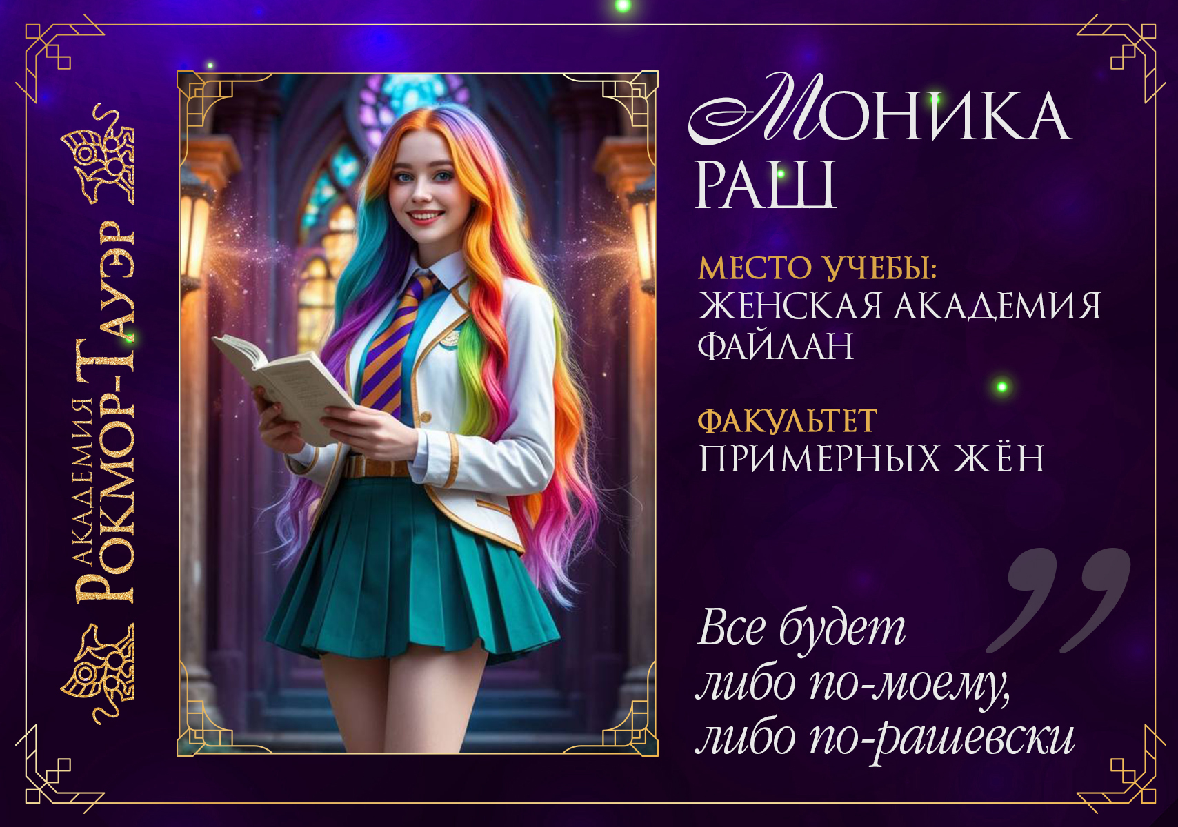Моника Раш: Добрый день! Меня зовут Моника Раш (усаживается на стул и что-то деловито отмечает у себя в блокноте). На данный момент я занимаюсь организацией самого крутого Зимнего бала, который видели стены Рокмор-Тауэр. Да, вы не ослышались, самого крутого. У меня по-другому не бывает!