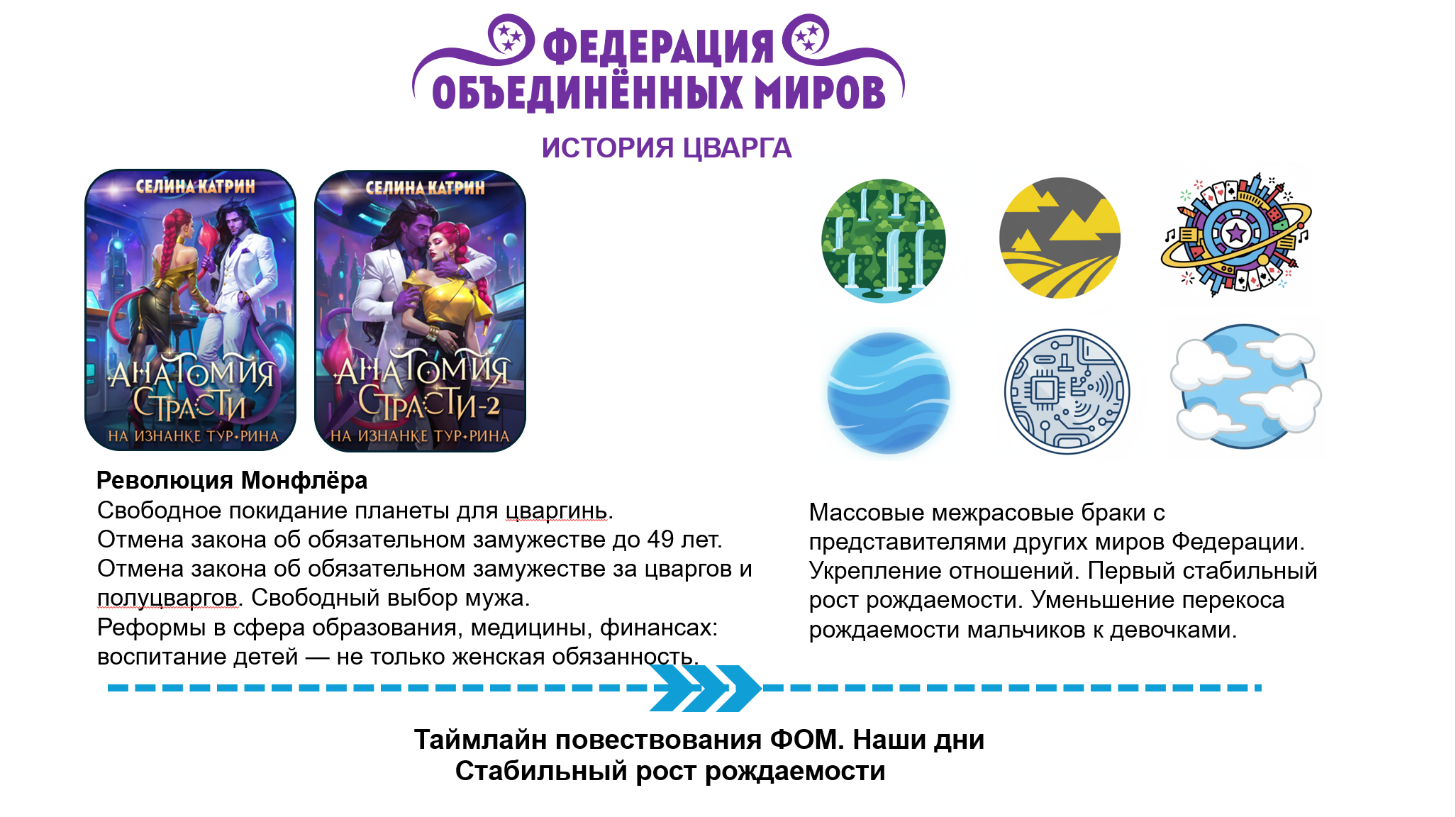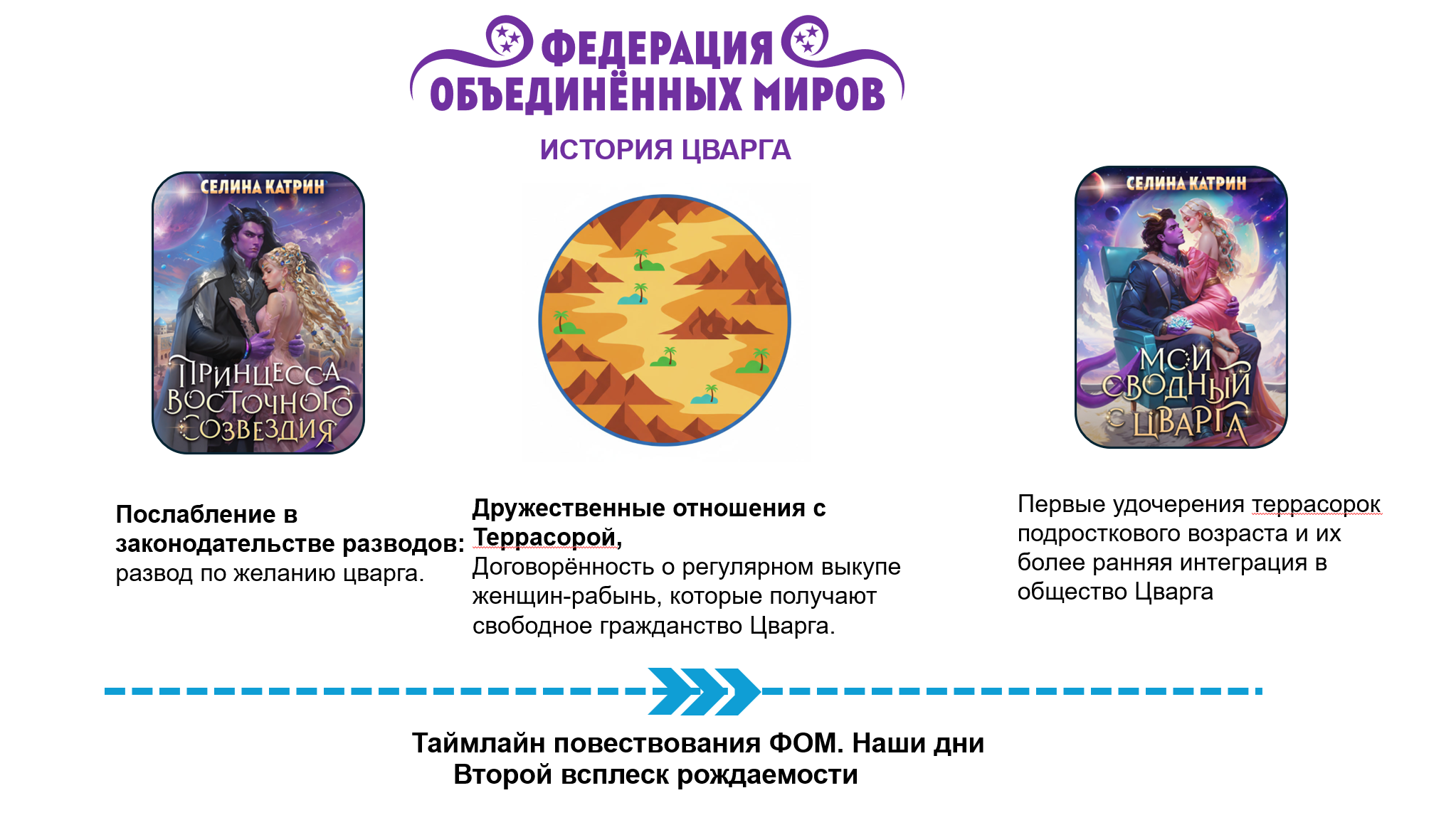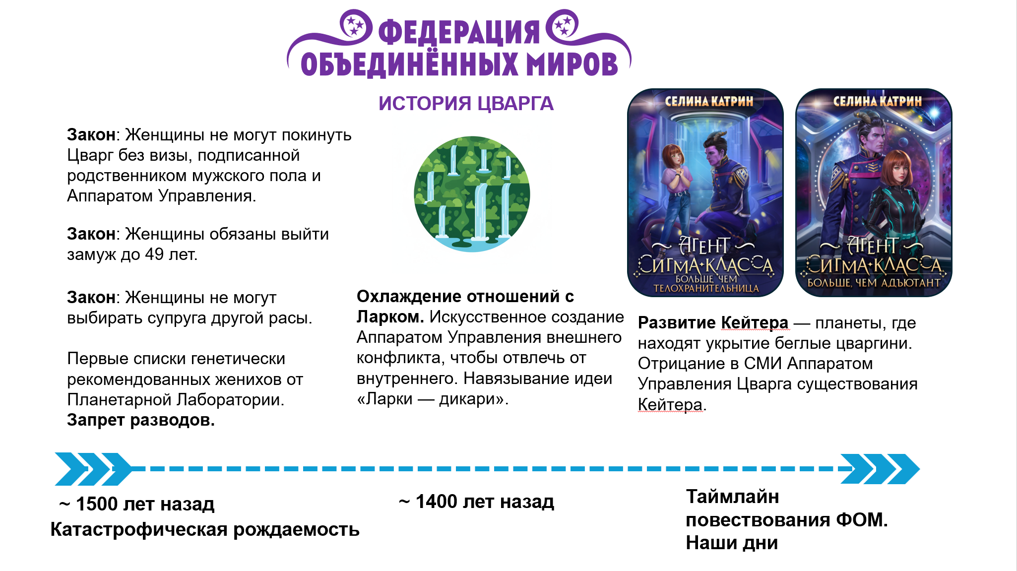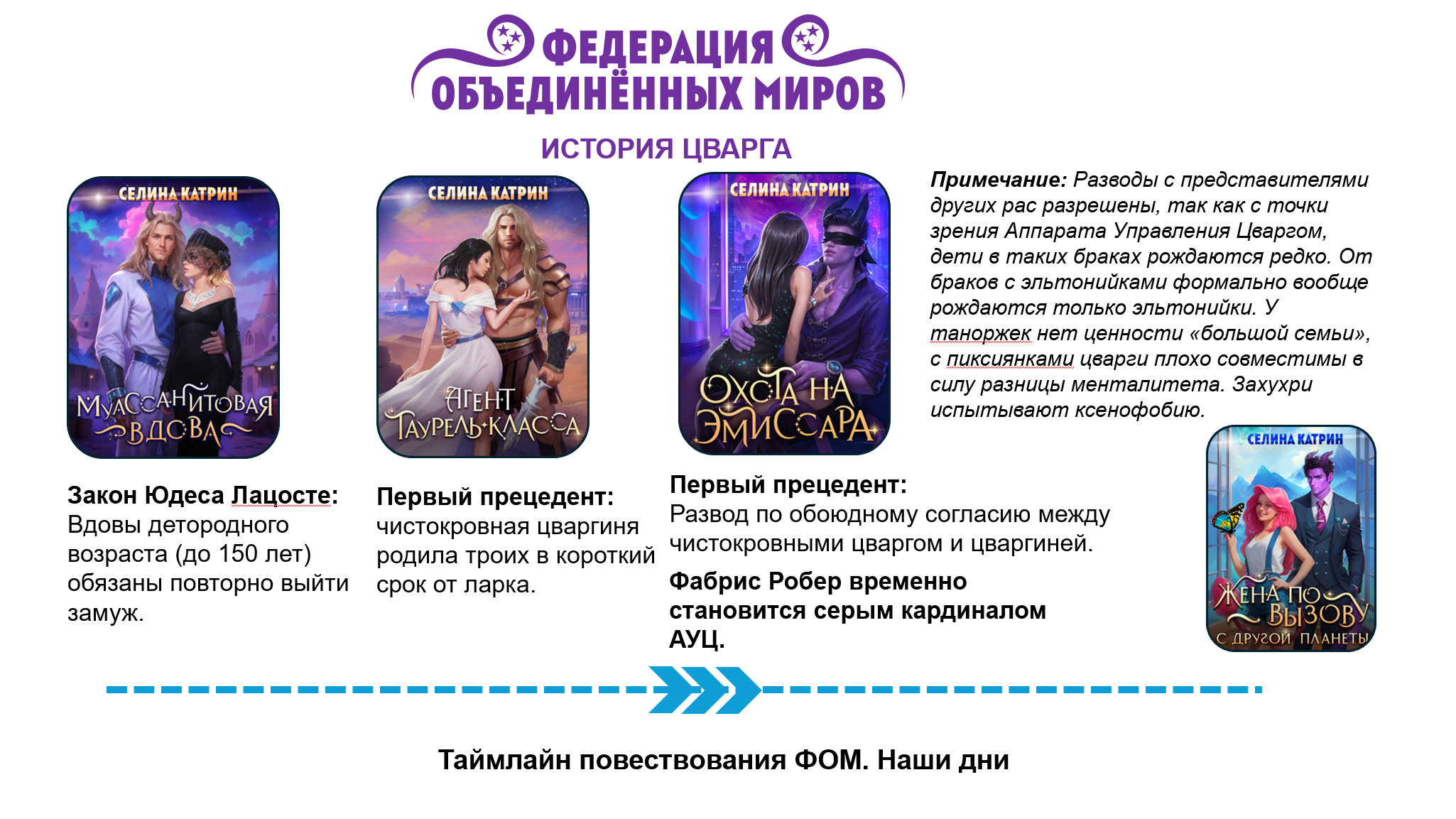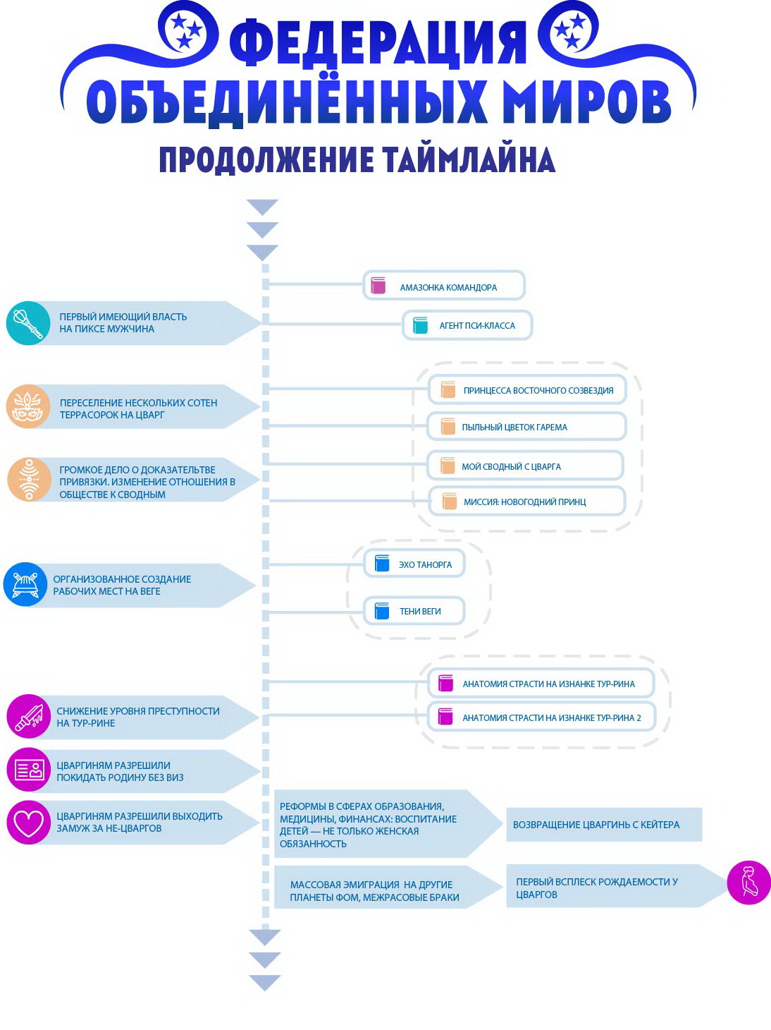 Вот такая история получилась лично у Цварга. Кроме того, я вписала историю этого Мира в таймлайн всей Федерации. Обновленная вторая часть таймлайна ниже, а полная схема находится в блоге Путеводителе