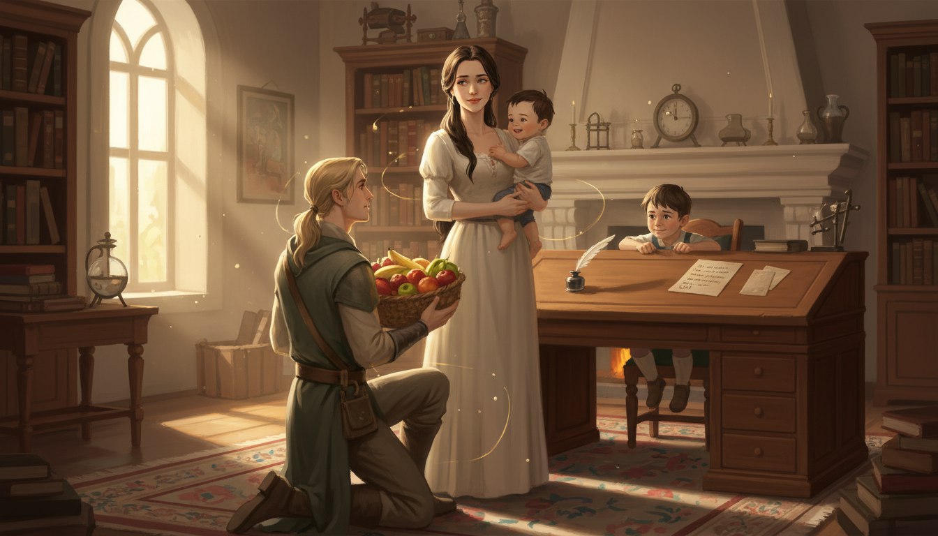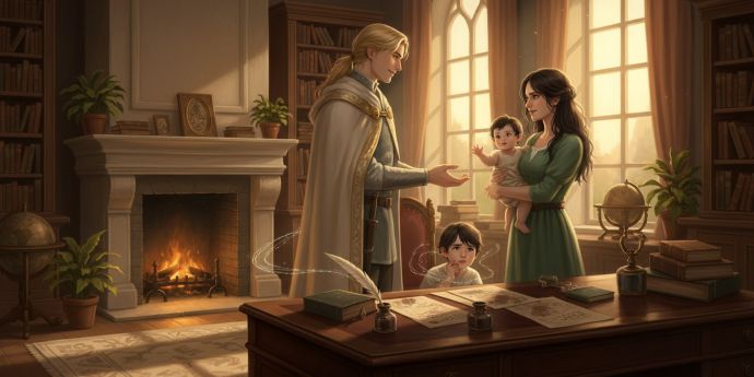 Мама поправила Кристиана, сидящего на бедре, поистине царственным жестом, точно это был не десятимесячный младенец, а символ королевской власти. Кристиан, мусоливший краешек маминого фартука, надетого в честь уборки, загулил и потянул к папе руки, но мама сделала вид, что в кабинете кроме нее и сыновей никого нет. Даже не посмотрела на папу. Обиделась. Сильно.