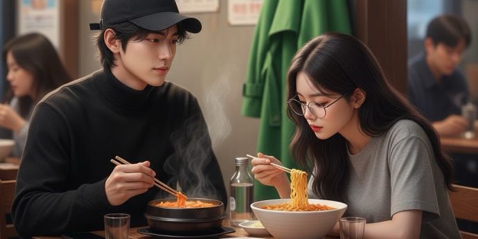 «Наён опустила взгляд в свою тарелку, подцепив палочками лапшу, пока та не разбухла, и, обжигая рот острым бульоном, начала есть. Это было чертовски приятно после тяжелого дня.»