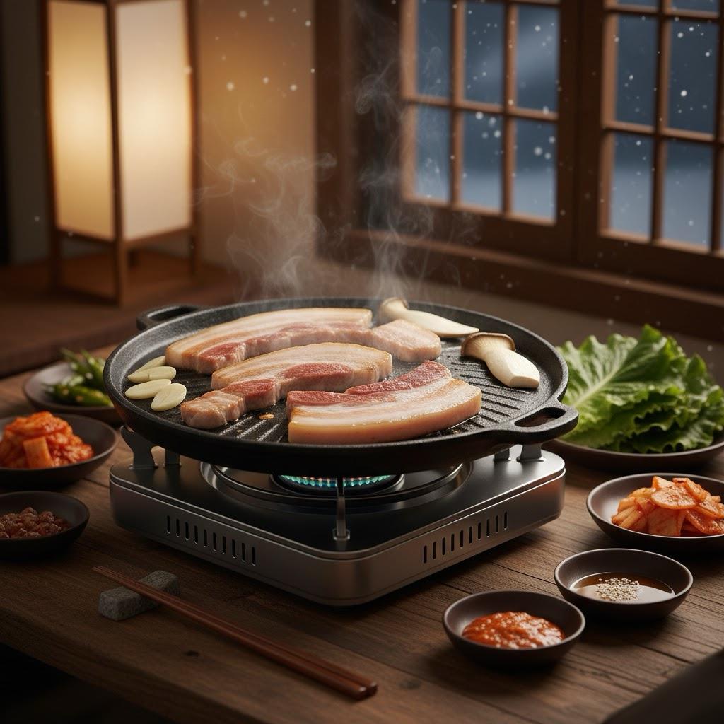 ❤️Самгёпсаль — корейское блюдо из свиной грудинки, которую жарят на гриле прямо за столом и едят, заворачивая в листья салата с соусами и гарнирами.