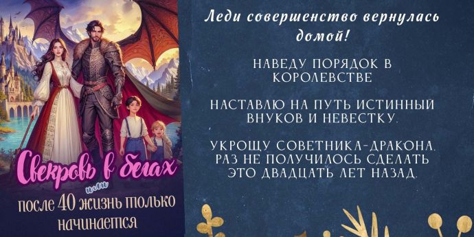 Ну, что, идеальная свекровь в деле! Она наведет порядок в королевстве, наставит на путь истинный внуков и невестку, укротит советника-дракона. Хватит скорбеть по прошлому! После сорока ведь жизнь только начинается!
