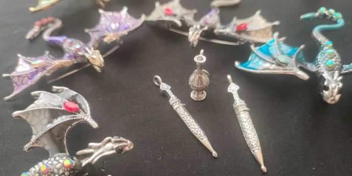 (итак, на кону оригинальные серебряные* подвески: кинжалы и кувшин от вождей орков, браслеты из экокожи от орчанок, брелок в виде стильного кувшина от их истинных пар - человечек, и еще броши-кулоны в виде драконов заодно).