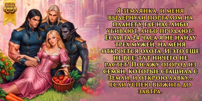 Я землянка, и меня выдернули порталом на планету, где нас либо убивают, либо продают. Если за 24 часа я не найду трех мужей, на меня откроется охота. И это еще не все: тут ничего не растет. Посажу огород из семян, которые стащила с Земли, и открою лавку… если успею выжить до завтра.
