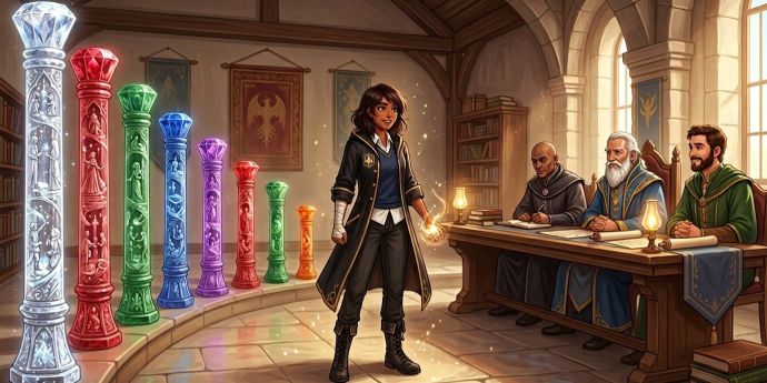 В помещении сидели три мага Академии, один из них указал рукой на девять цельнокаменных колонн разнообразных оттенков, стоявших в ряд. Они были несколько изогнутыми, узкими внизу, но плавно расширялись к вышине. Каждую колонну украшала искусная резьба: сцены, будто деления шкалы, символизировавшие различные заклинания, как я решила, от простого к сложному в пределах одного уровня. Красивейшая и тончайшая работа, котрую хотелось рассмотреть более детально.