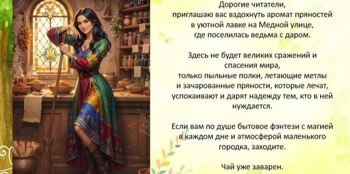 Здесь не будет великих сражений и спасения мира, только пыльные полки, летающие метлы и зачарованные пряности, которые лечат, успокаивают и дарят надежду тем, кто в ней нуждается.