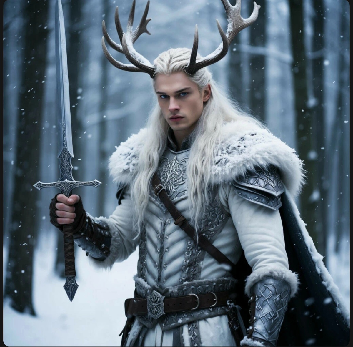 В самом сердце древнего зимнего леса, где вековые ели хранят тайны веков, а снег искрится серебром под луной, обитает удивительное создание — Белый олень. Никто не знает, сколько столетий он бродит по этим заснеженным просторам, но местные легенды гласят, что это не просто волшебное животное. Это — Последний страж, древнее существо, наделённое способностью принимать облик прекрасного молодого мужчины с длинными белыми волосами и пронзительно-тёмно-синими глазами, в которых отражается мудрость тысячелетий.